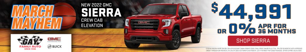 - 2022 GMC Sierra Crew Cab Elevation – $44,991 and 0% APR up to 36 months