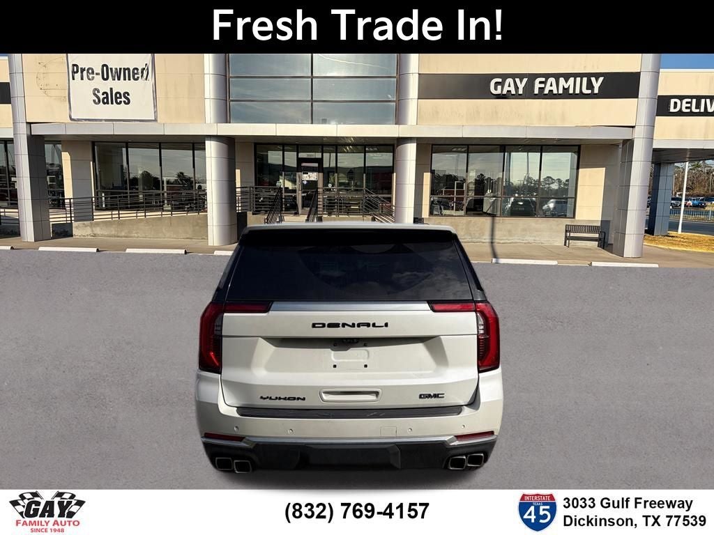 Clean CARFAX. White Frost 2025 GMC Yukon Denali 4WD 10-Speed Automatic with Overdrive 3.0L I6 25th Anniversary Denali Package (24 Black Wheels, Black GMC Emblems, Black Mesh Grille, Black Nameplates, and Wheels: 24 x 9.5 Steel Interim), Advanced Security Package (Glass Breakage Sensor, Theft-Deterrent Alarm System, Vehicle Inclination Sensor, and Vehicle Interior Movement Sensor), Advanced Technology Package (3 Years of OnStar Services/Safety Services, Driver Attention Assist, Inside Rearview Auo-Dimming Rear Camera Mirror, Rear Seat Media System, and Super Cruise), Denali Reserve Package (Dual-Pane Panoramic Power Sunroof and Power-Retractable Assist Steps), Enhanced Trailering Technology Package (Trailer Camera Provisions, Trailering Assist Guidelines, and Wired Auxiliary Trailer Camera), Floor Liner Package (3rd Row All-Weather Floor Liners, All-Weather Cargo Mat, and First and Second Rows Premium Floor Liners), License Plate Front Mounting Package, Max Trailering Package (Blind Zone Steering Assist with Trailering, Extra Capacity Cooling System, Hill Descent Control, Hitch View, Integrated Trailer Brake Controller, and Smart Trailer Integration Indicator), Preferred Equipment Group 5SA (15 Diagonal Multi-Color Head-Up Display, 4-Way Power Driver Lumbar Seat Adjuster, 4-Way Power Front Passenger Lumbar Seat Adjuster, AutoSense Hands-Free Power Liftgate, Bright Front and Rear Door Sill Plates, Dual Exhaust System, Galvano Bodyside Moldings, Magnetic Ride Control Suspension, Perforated Heather and Ventilated Driver and Front Passenger Seats, Power Release 2nd Row Bucket Seats, Power Tilt and Telescopic Steering Column, and Wheels: 20 x 9 6-Spoke Polished Aluminum), 4WD, 1.5 KW Heater/Defrost Air System, 10 Speakers, 250 Amps Alternator, 3 Years SiriusXM, 3.23 Rear Axle Ratio, 3rd row seats: split-bench, 4-Wheel Disc Brakes, 850 Cold-Cranking Amps Battery, ABS brakes, Adaptive suspension, Air Conditioning, Air Ride Adaptive Suspension, Alloy wheels, AM/FM radio: SiriusXM with 360L, Apple CarPlay/Android Auto, Audio memory, Auto High-beam Headlights, Auto-dimming door mirrors, Auto-dimming Rear-View mirror, Auto-leveling suspension, Automatic temperature control, Black Mirror Caps, Bodyside moldings, Bose 10-Speaker Surround with CenterPoint, Brake assist, Bumpers: body-color, Compass, Delay-off headlights, Diesel B20 Fuel, Driver door bin, Driver vanity mirror, Dual front impact airbags, Dual front side impact airbags, Electronic Stability Control, Emergency communication system: OnStar and GMC connected services capable, Engine Block Heater, Exterior Parking Camera Rear, Four wheel independent suspension, Front anti-roll bar, Front Bucket Seats, Front Center Armrest, Front dual zone A/C, Front fog lights, Front reading lights, Fully automatic headlights, Garage door transmitter, Heads-Up Display, Heated door mirrors, Heated Driver and Front Passenger Seats, Heated front seats, Heated rear seats, Heated steering wheel, Illuminated entry, Low tire pressure warning, Memory seat, Navigation system: GMC Connected Navigation, Occupant sensing airbag, Outside temperature display, Overhead airbag, Overhead console, Panic alarm, Passenger door bin, Passenger vanity mirror, Perforated Leather Seating Surfaces, Power door mirrors, Power driver seat, Power Liftgate, Power passenger seat, Power steering, Power windows, Radio: 16.8 Diagonal Premium GMC Infotainment System, Rain sensing wipers, Rear air conditioning, Rear anti-roll bar, Rear reading lights, Rear window defroster, Rear window wiper, Remote keyless entry, Security system, SiriusXM with 360L, Speed control, Speed-sensing steering, Split folding rear seat, Spoiler, Steering wheel memory, Steering wheel mounted audio controls, Tachometer, Telescoping steering wheel, Tilt steering wheel, Traction control, Trip computer, Turn signal indicator mirrors, Upper and Lower Active Aero Shutters, Variably intermittent wipers, Ventilated front seats, and Voltmeter. 4WD. Recent Arriv