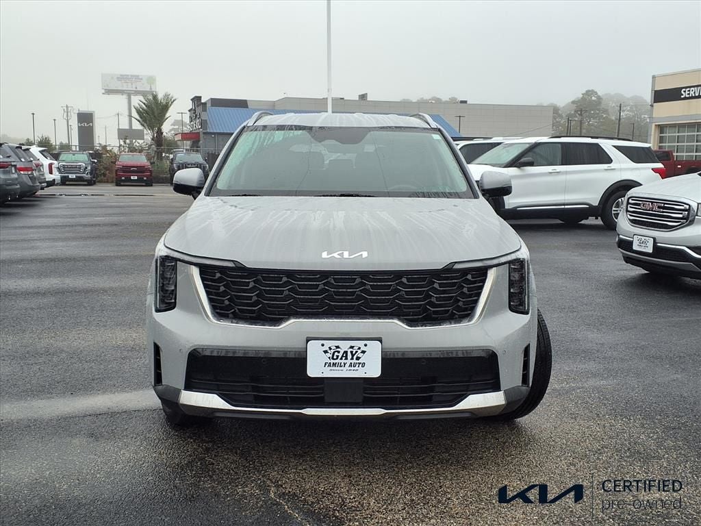 CARFAX One-Owner. Clean CARFAX. Certified. Wolf Gray 2025 Kia Sorento S FWD 8-Speed Automatic 2.5L I4 DGI DOHC 16V LEV3-SULEV30 191hp Kia Certified Pre-Owned Certified, 6 Speakers, AM/FM radio: SiriusXM, Auto High-beam Headlights, Exterior Parking Camera Rear, Navigation System, Radio data system, 3rd row seats: split-bench, 4-Wheel Disc Brakes, ABS brakes, Air Conditioning, Alloy wheels, Apple CarPlay & Android Auto, Automatic temperature control, Brake assist, Bumpers: body-color, Carpeted Floor Mats, Delay-off headlights, Driver door bin, Driver vanity mirror, Dual front impact airbags, Dual front side impact airbags, Electronic Stability Control, Emergency communication system: 911 Connect, Four wheel independent suspension, Front anti-roll bar, Front Bucket Seats, Front Center Armrest, Front dual zone A/C, Front reading lights, Fully automatic headlights, Heated door mirrors, Heated Front Bucket Seats, Heated front seats, Illuminated entry, Knee airbag, Leather Shift Knob, Leather steering wheel, Low tire pressure warning, Occupant sensing airbag, Outside temperature display, Overhead airbag, Overhead console, Panic alarm, Passenger door bin, Passenger vanity mirror, Power door mirrors, Power driver seat, Power steering, Power windows, Radio: AM/FM Standard Sound System, Rear anti-roll bar, Rear reading lights, Rear seat center armrest, Rear side impact airbag, Rear window defroster, Rear window wiper, Remote keyless entry, Security system, Speed control, Speed-sensing steering, Split folding rear seat, Spoiler, Steering wheel mounted audio controls, SynTex Artificial Leather Seat Trim, Tachometer, Telescoping steering wheel, Tilt steering wheel, Traction control, Trip computer, Turn signal indicator mirrors, Variably intermittent wipers, and Wheels: 18 Gloss Black Alloy. *KIA CERTIFIED!!*, *CLEAN CARFAX!!*, 6 Speakers, AM/FM radio: SiriusXM, Auto High-beam Headlights, Exterior Parking Camera Rear, Navigation System, Radio data system. Recent Arrival! Kia Certified Pre-Owned Details: