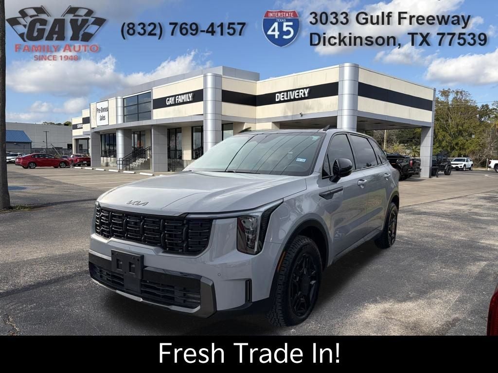 CARFAX One-Owner. Clean CARFAX. Certified. Gray 2025 Kia Sorento X-Pro SX Prestige AWD 8 Speed Dual Clutch 2.5L I4 DGI Turbocharged DOHC 16V LEV3-SULEV30 281hp Kia Certified Pre-Owned Certified, AWD, 12 Speakers, AM/FM radio: SiriusXM, Navigation System, 3rd row seats: split-bench, 4-Wheel Disc Brakes, ABS brakes, Air Conditioning, Alloy wheels, Apple CarPlay & Android Auto, Auto High-beam Headlights, Auto-dimming Rear-View mirror, Automatic temperature control, Brake assist, Bumpers: body-color, Carpeted Floor Mats, Chrome Wheel Locks, Delay-off headlights, Driver door bin, Driver vanity mirror, Dual front impact airbags, Dual front side impact airbags, Electronic Stability Control, Emergency communication system: 911 Connect, Exterior Parking Camera Rear, Four wheel independent suspension, Front anti-roll bar, Front Bucket Seats, Front Center Armrest, Front dual zone A/C, Front fog lights, Front reading lights, Fully automatic headlights, Garage door transmitter: HomeLink, Heated & Ventilated Front Bucket Seats, Heated door mirrors, Heated front seats, Heated rear seats, Heated steering wheel, Illuminated entry, Knee airbag, Leather Shift Knob, Leather steering wheel, Low tire pressure warning, Memory seat, Occupant sensing airbag, Outside temperature display, Overhead airbag, Overhead console, Panic alarm, Passenger door bin, Passenger vanity mirror, Perforated Genuine Leather Seat Trim, Power door mirrors, Power driver seat, Power Liftgate, Power moonroof, Power passenger seat, Power steering, Power windows, Radio data system, Radio: AM/FM Bose Premium Audio System, Rain sensing wipers, Rear anti-roll bar, Rear reading lights, Rear side impact airbag, Rear window defroster, Rear window wiper, Remote keyless entry, Security system, Speed control, Speed-sensing steering, Split folding rear seat, Spoiler, Steering wheel mounted audio controls, Tachometer, Telescoping steering wheel, Tilt steering wheel, Traction control, Trip computer, Turn signal indicator mirrors, Variably intermittent wipers, Ventilated front seats, and Wheels: 17 Gloss Black Alloy. *KIA CERTIFIED!!*, *CLEAN CARFAX!!*, AWD, 12 Speakers, AM/FM radio: SiriusXM, Navigation System. Recent Arrival! Kia Certified Pre-Owned Details: